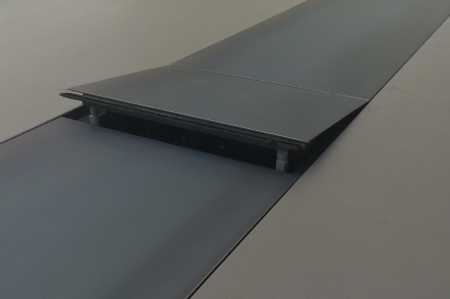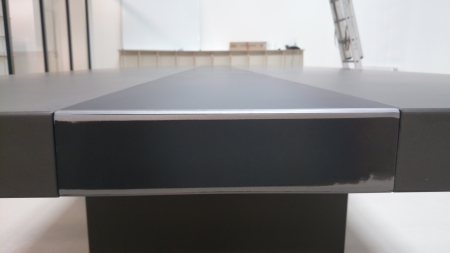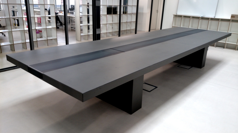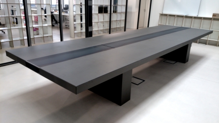 Konferenztisch in ImiBeton anthrazit glatt mit eingelegtem Stahlblech. Strom und Versorgungseinheit mit Liftfunktion