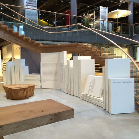 Austellungszentrum Holz Roeren, Firmenhistorie in Buchform, Eichenbaumstamm geschliffen, geölt