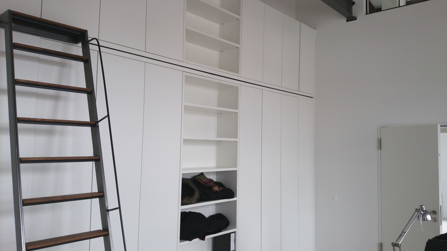 Aktenschrank in Kunststoff weiß, Bibliotheksleiter aus Rohstahl mit Eichentrittstufen