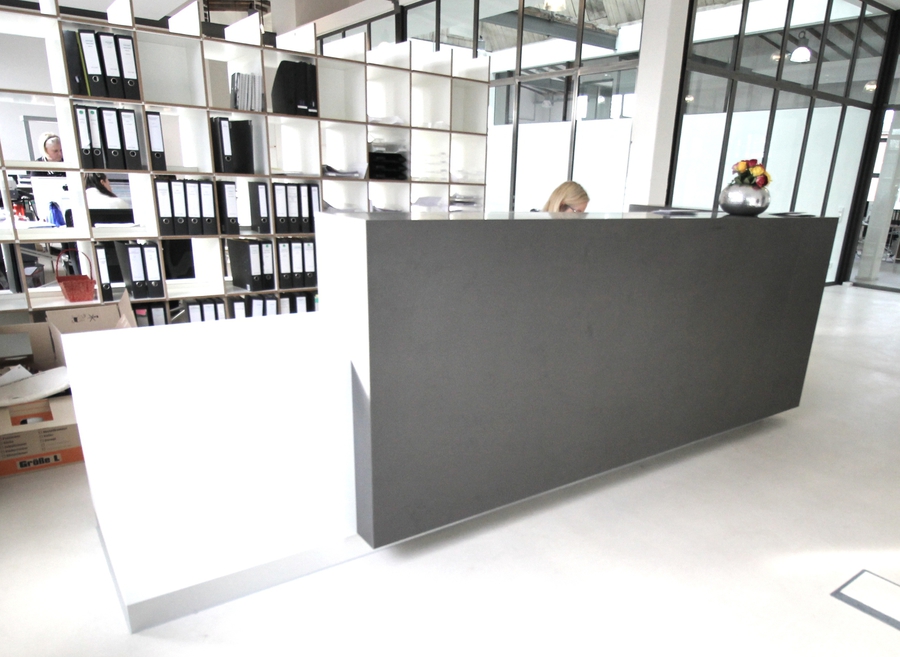 Empfangstheke aus ImiBeton anthrazit glatt und Weißlack
