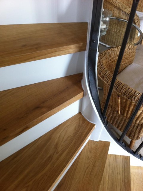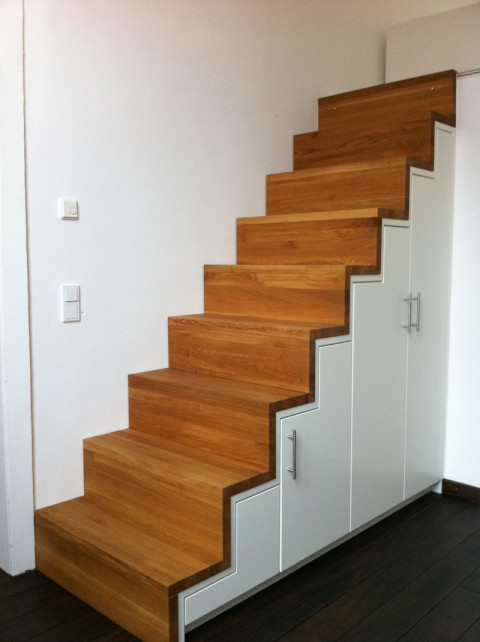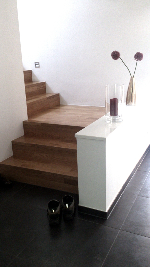Treppenbelegung in Eiche. Mauerauflage aus MDF Weißlack mit aufgelegter, rückseitig weiß lackierter Glasscheibe