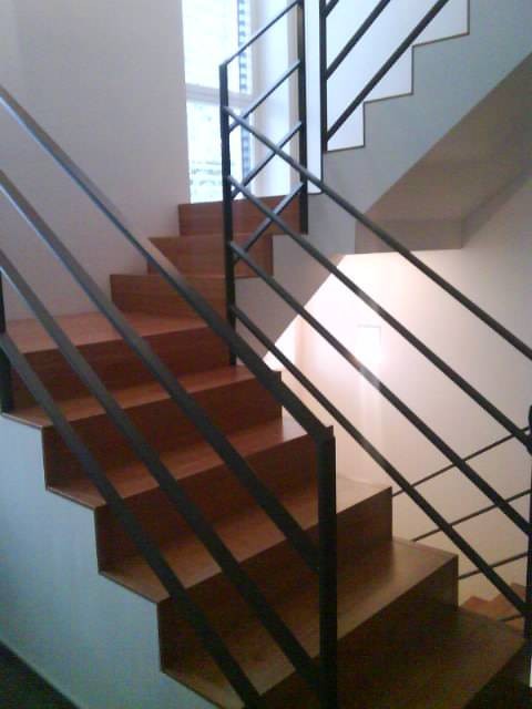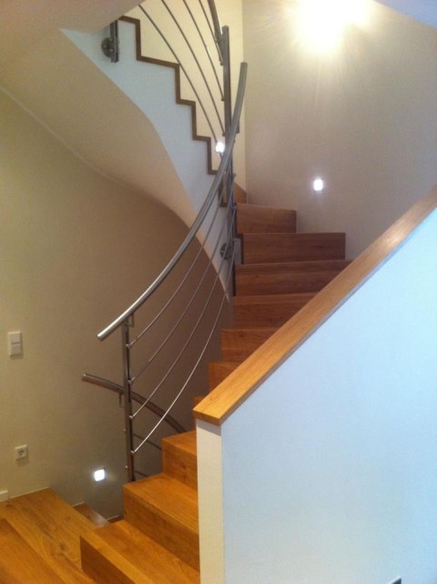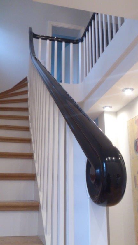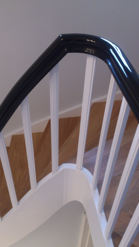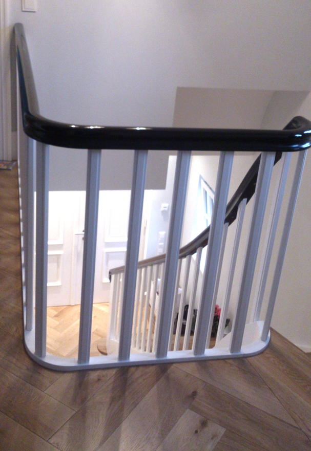 Geländerstäbe und Wangen in Buche Weißlack. Handlauf schwarz hochglanz lackiert und poliert.